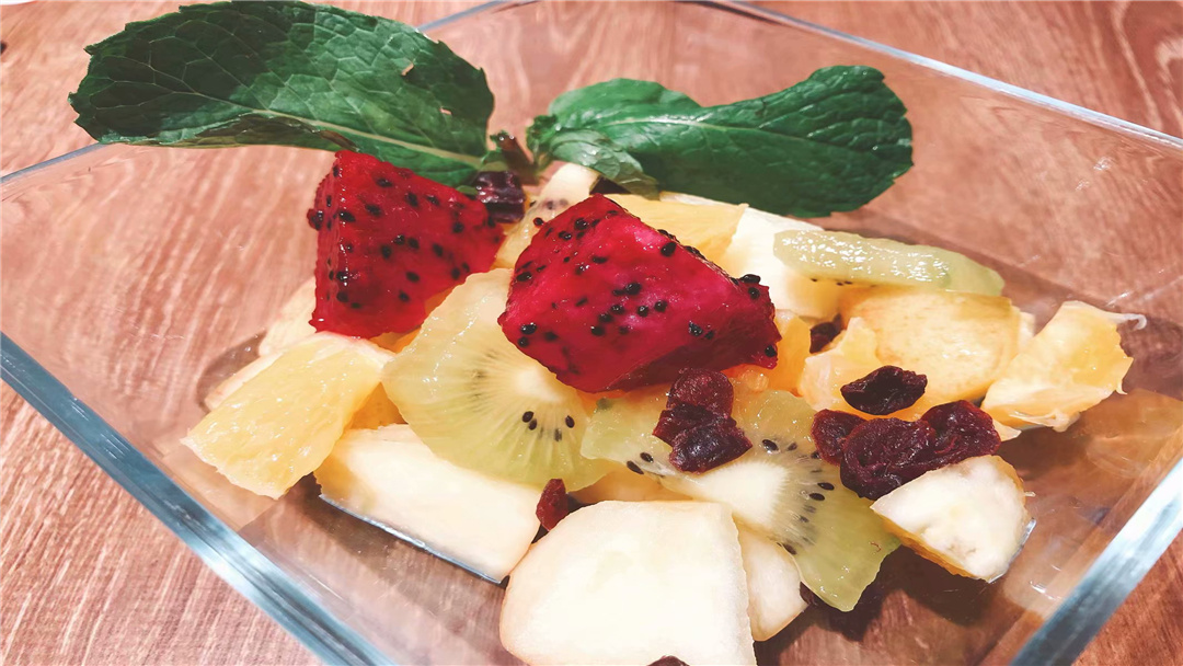 再來一份生果沙拉,內在的事務有些罕見的獼猴桃、火水電龍果、鳳梨和蘋果等,配醬是生果沙拉醬和酸奶,需求空調工程本身攪拌,比吃單一的生果養分甘旨口感更為豐盛,酸甜可口,也是一道減肥和美容的窗簾盒聖品。