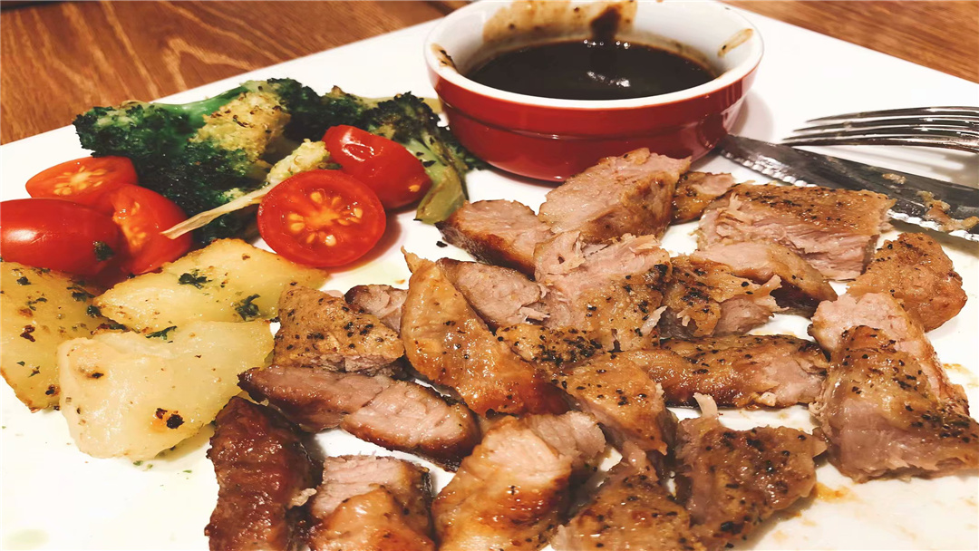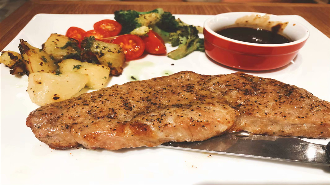 新澳洲西冷牛排切好之後澆上大理石黑椒汁口感是最合適的,再搭配上西藍花、西紅柿和土豆等輔料,擺盤都雅且葷素搭配。牛肉肉質含必定肥油,有白色肉筋,肉質口感鮮嫩,有嚼勁。